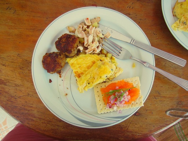 Onsdag morgon och dags för en rekorderlig frukost. Kockarna hade släpat med sig diverse läckerheter som ost, lax och knäckebröd, och Peter och Nils-Owe hade förtjänstfullt bidragit med hembakat bröd, hemgjord leverpastej, pressylta och dansk "rolle-pölse". Självklart var även aquavit, GaJol och Gammeldansk framdukat!