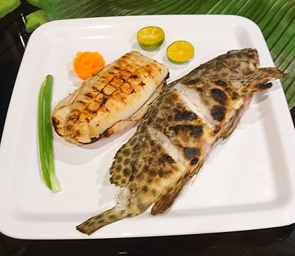 Halstrad Grouper och Snapper serverad med aioli, ris och grönsaker