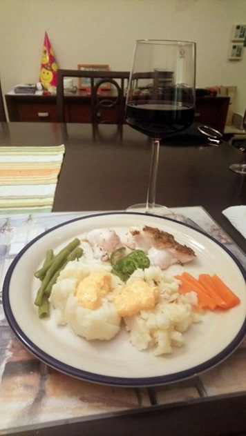 Ugnsformen fick sig en rejäl dos av det vita vinet, lite olivolja, en del smör, lite Teriyakisås och torkad timjan. Sedan gick vi loss på kryddskåpet och gjorde en improviserad specialkryddning á la BGS 8-62. Fisken serverades med potatismos toppad med en mix av Philadelphia, wasbi och räkrom, rundbönor, morötter plus en liten dutt av japansk sjögrässallad.