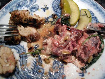 Ankbröst, rödbetssallad, äpplen, någon röd marmelad, sås