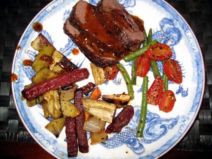 Serveras med rotsaker, pepparsås, stekta körsbärstomater & haricot verts