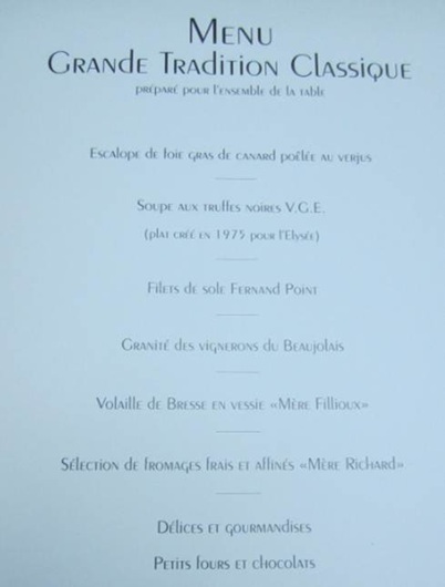 Vilket ställe och vilken service, det var nog en källarmästare per bord och där är verkligen kunden kung! Sedan skall vi inte snacka om maten och det var svårt att välja mellan alla godsakerna men här kan ni se en typisk klassik Menu och man bör vara hungrig för att orka igenom allt.
