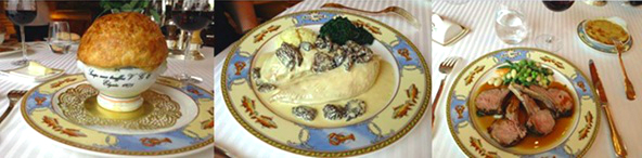 Till vänster den berömda entree'n som Paul serverade till Franske Presidenten 1975 och som sedan dess har varit standard på menyn. Det är en inbakad soppa men mycket tryffel och Fois Gras i. Därefter smakade vi på, enkelt uttryckt, kyckling med murklor i vitvinssås samt helstekt lammkrona i rödvinssås med primörer.